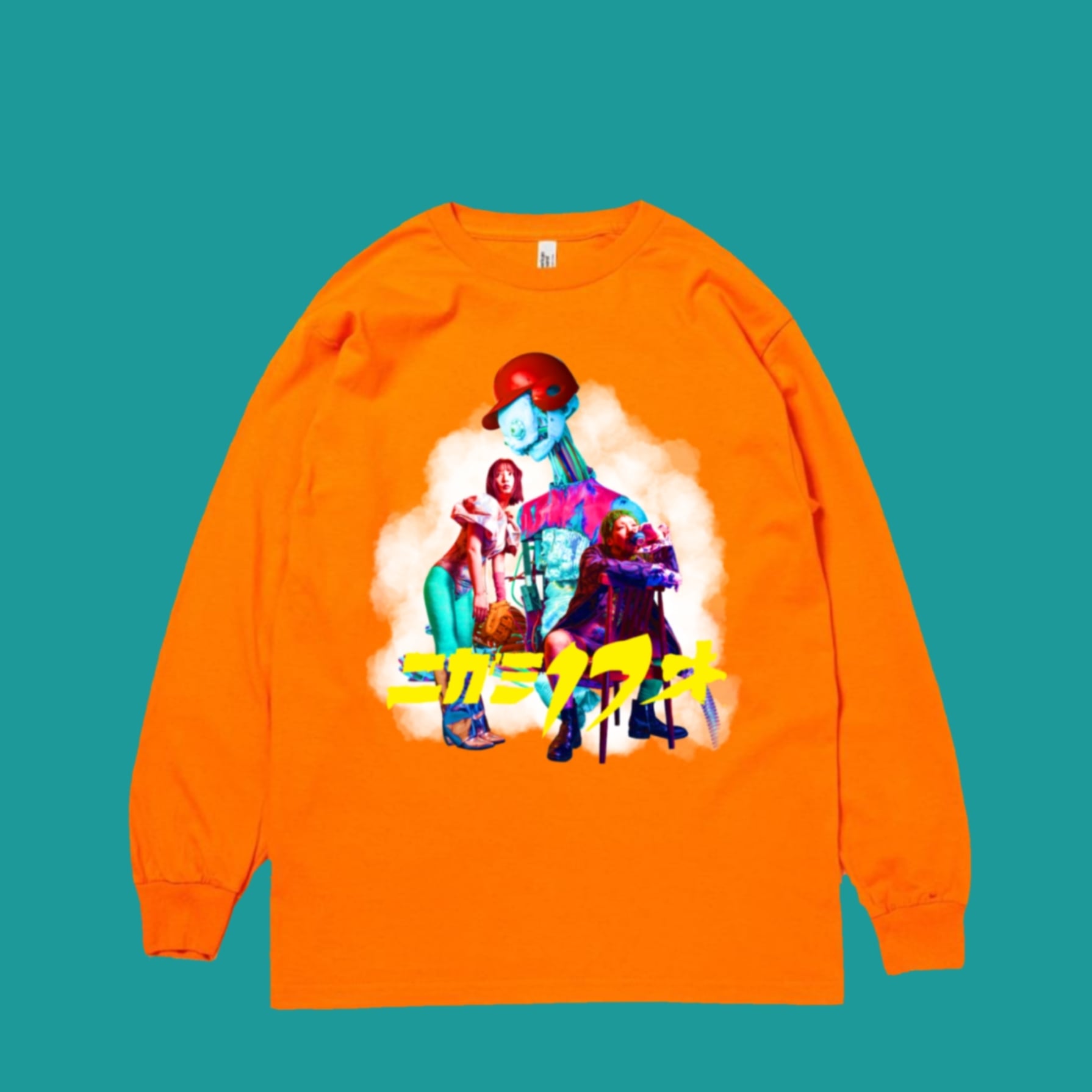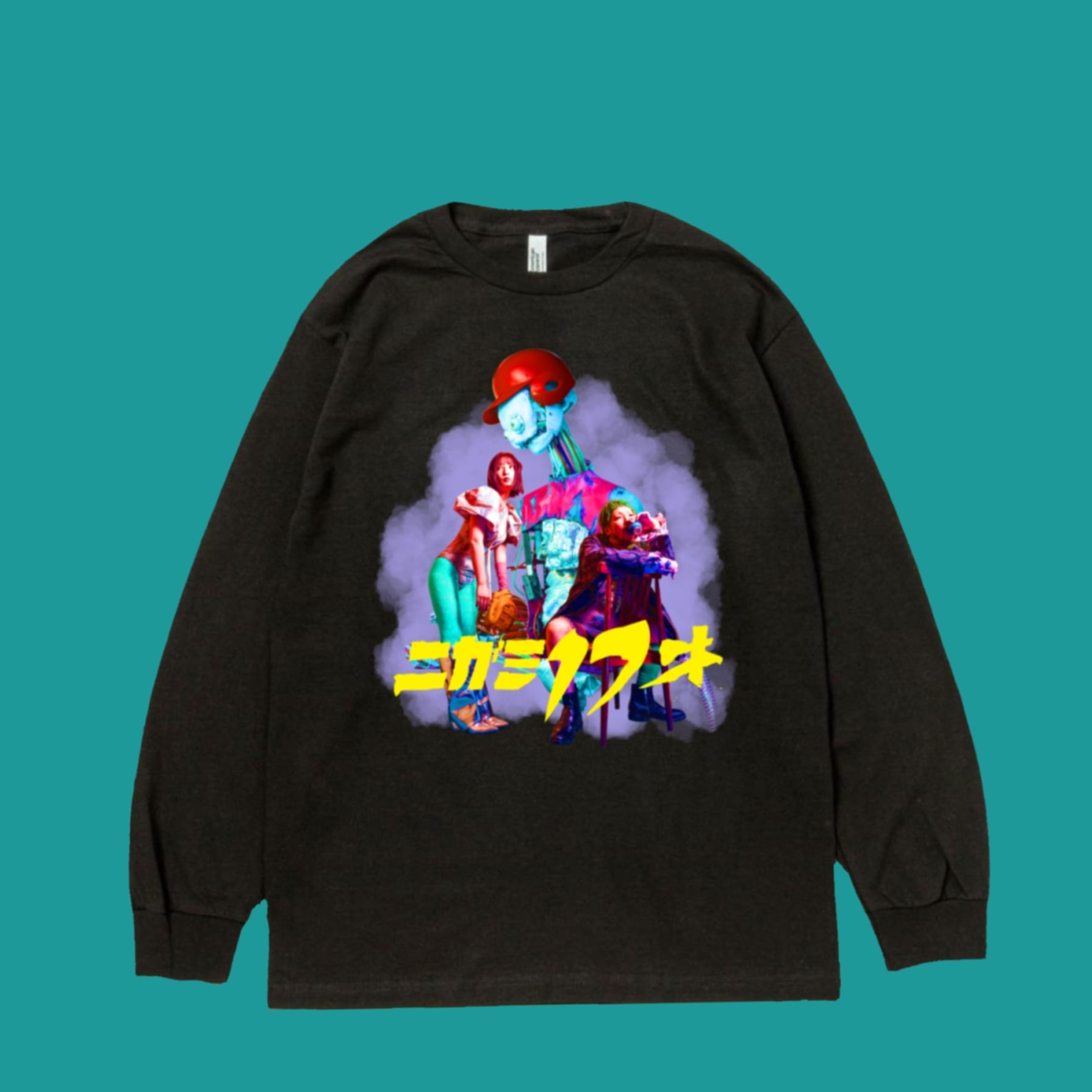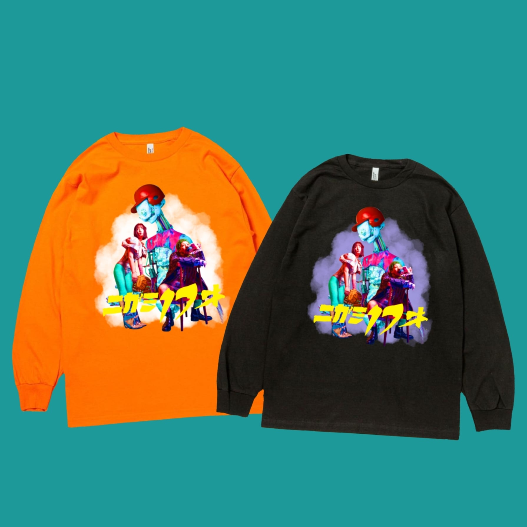 ニガミ17才のメンバー写真を使用し、どこか懐かしいSF映画のポスターのような世界観であくびがデザインを仕上げたロングスリーブTシャツです。
