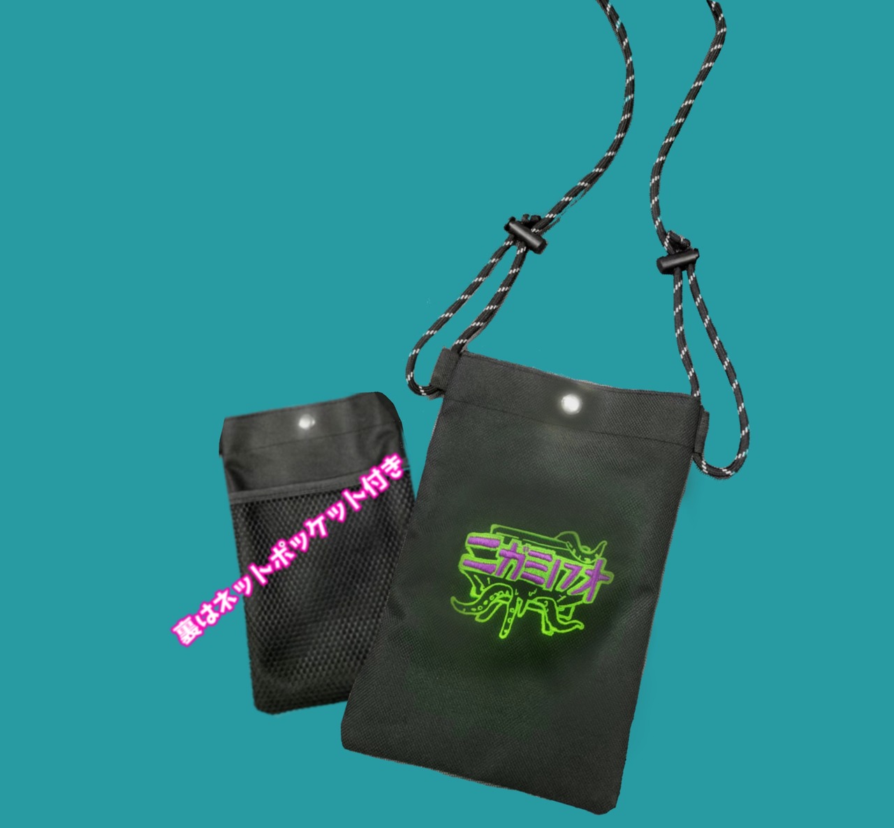 ニガミ17才の刺繍がどでーんと目立つポシェットです!裏はメッシュポケットが付いててスマホもすっぽり入るよ!